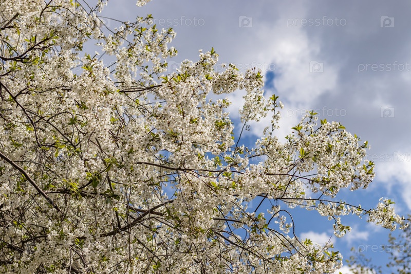 Ветки цветущего дерева. Вишневое дерево в белых цветах. весенний солнечный день