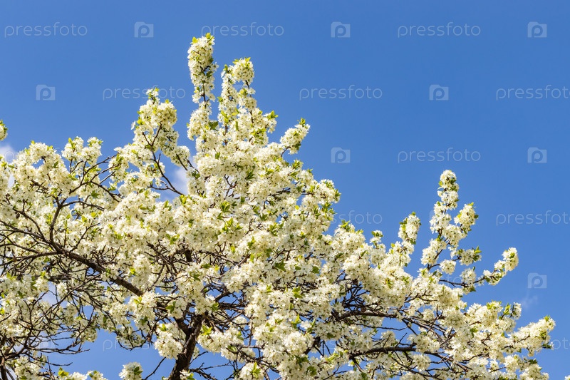 Ветки цветущего дерева. дерево, полное белых цветов. весенний солнечный день. крупным планом