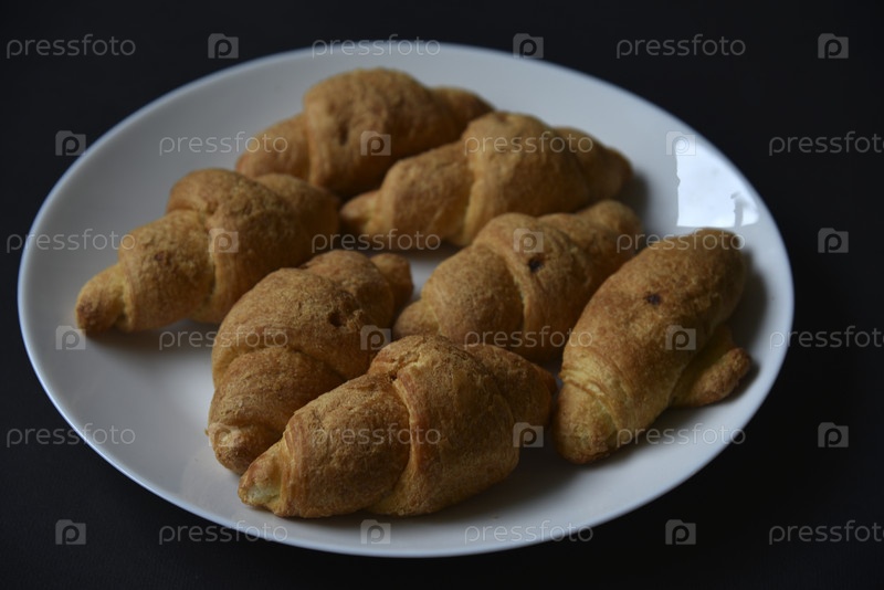 Французские круассаны на белой тарелке. Вкусные и сладкие круассаны. Сладкий завтрак на черном фоне. Европейская кухня