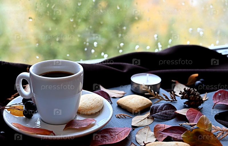 Осенний натюрморт с чашкой кофе, печеньем и бордовыми листьями