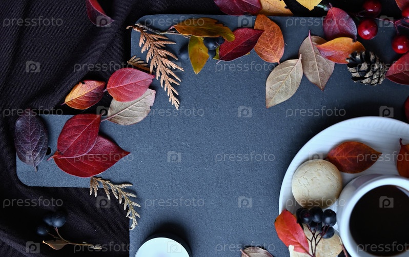 Осенний натюрморт с чашкой кофе, печеньем и бордовыми листьями