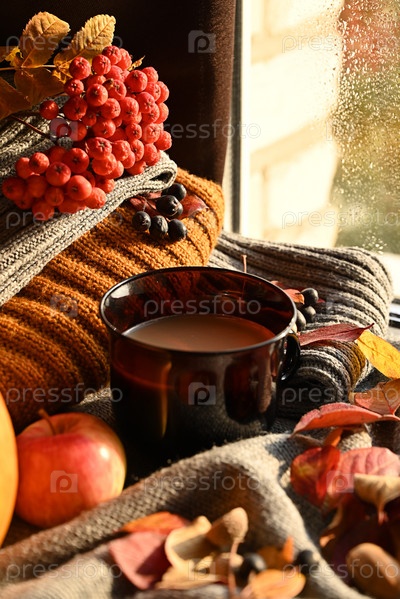 Осенний натюрморт с чашкой кофе, осенними листьями, тыквой. Вечернее время, не выходя из дома