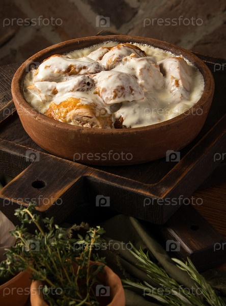 Вертикальный снимок курицы в сливочном соусе