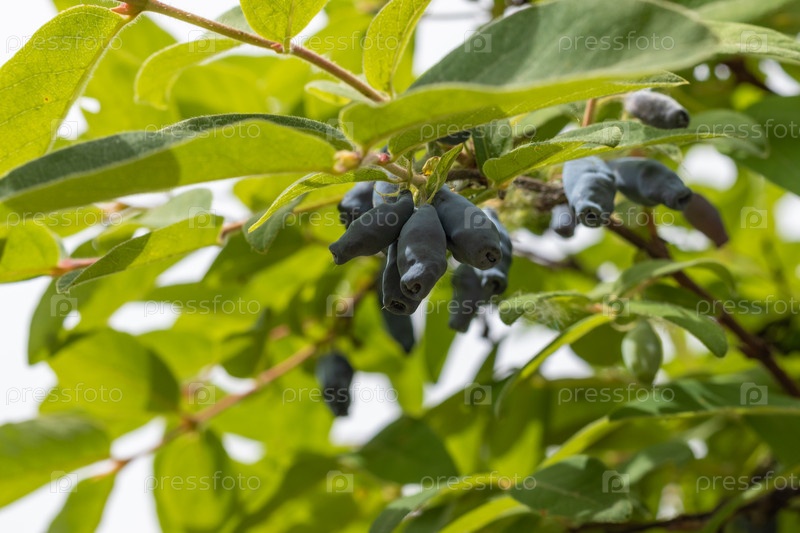Зрелые ягоды съедобного злака Lonicera на ветке на фоне зеленых листьев. крупный план