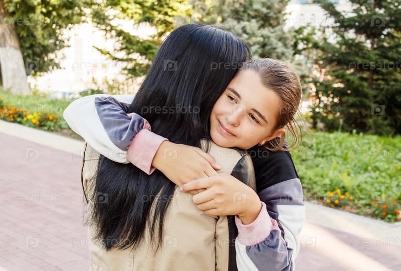 Девочка-подросток обнимает маму в городском парке