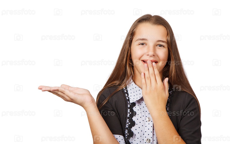 Удивленная девочка-подросток показывает товар