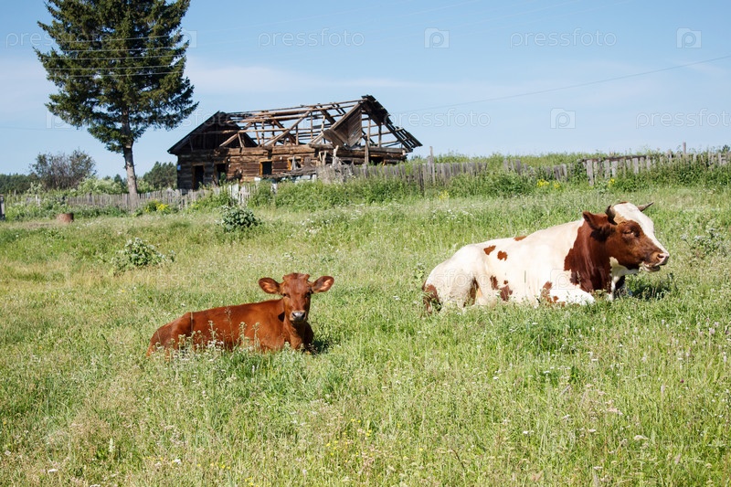 Сельский пейзаж с пасущимися коровами в сибири в летний день