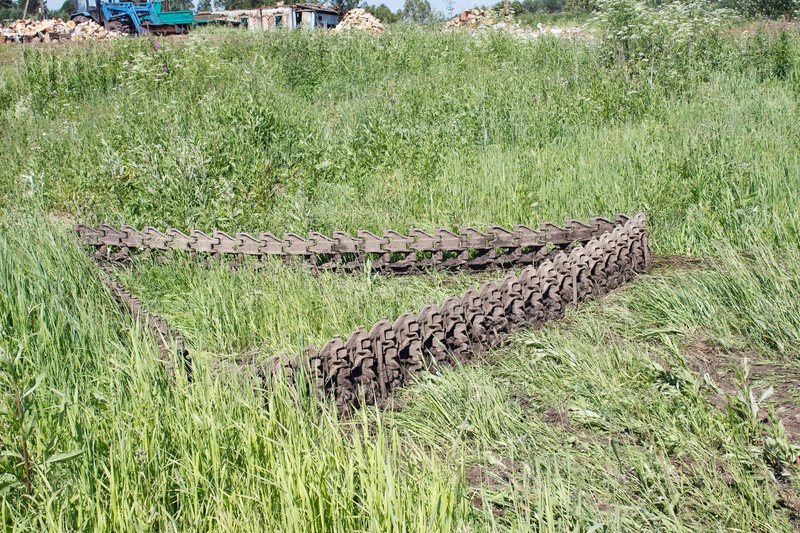 Гусеница трактора лежит на траве в летний день