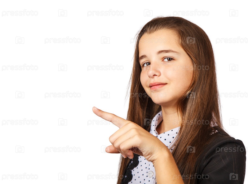 Позитивная брюнетка-подросток показывает товар
