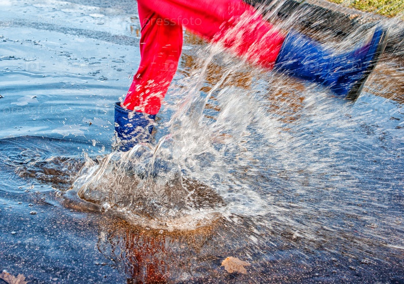 Девушка стоит в луже с брызгами воды