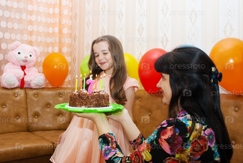 Мама дарит дочери торт на день рождения