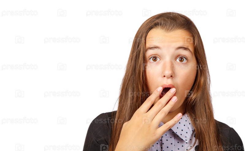 Удивленная брюнетка-подросток прикрывает рот рукой