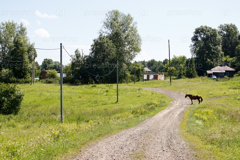 Грунтовая дорога в сибирской деревне в солнечный летний день