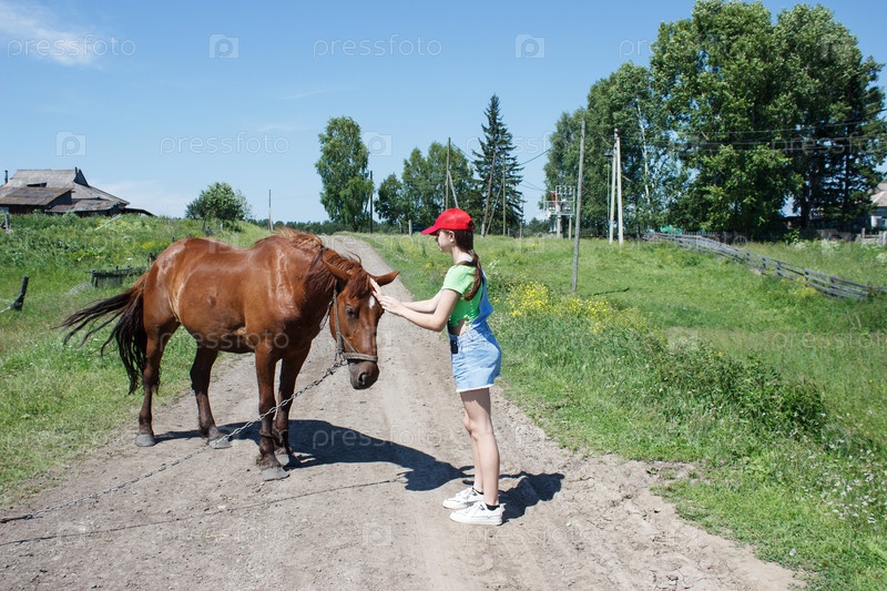 Красивая брюнетка играет с лошадью в сибирской деревне летом
