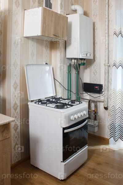 Новый современный белый газовый котел и белая газовая плита