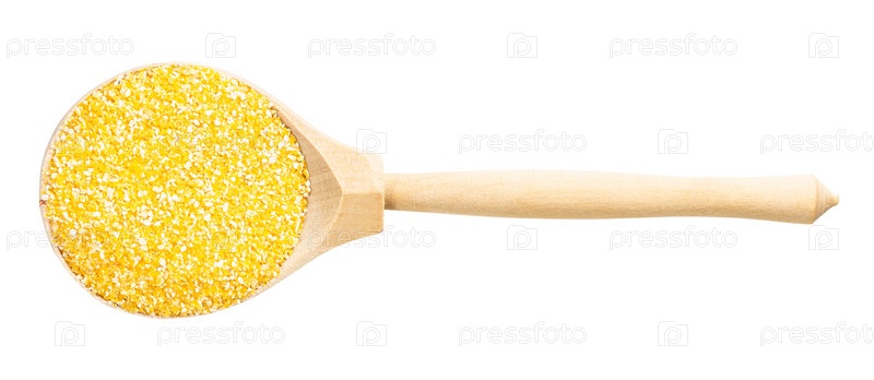 Вид сверху на деревянную ложку с кукурузной мукой грубого помола
