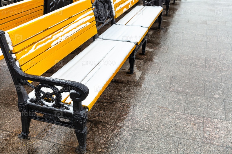 Желтая деревянная скамейка, покрытая снегом на площади