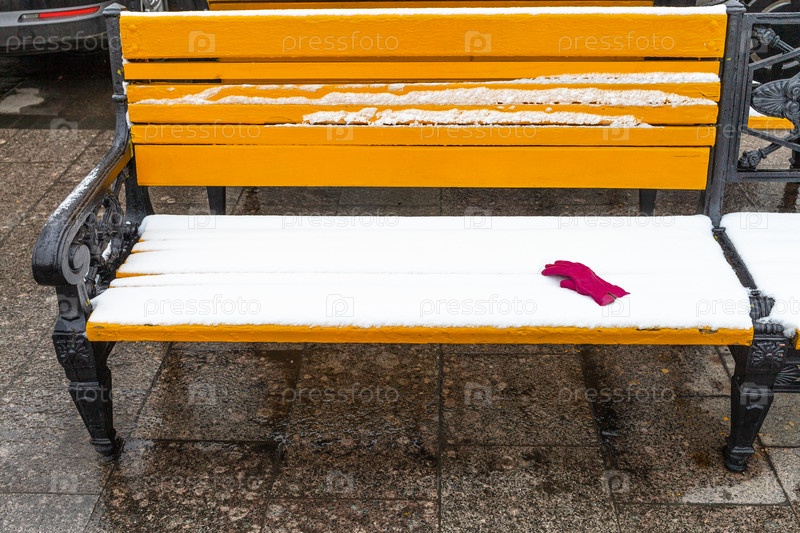 Желтая скамейка, покрытая снегом, с красной женской перчаткой