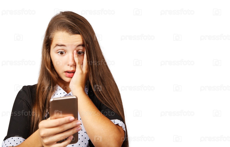Девочка-подросток с удивлением смотрит на дисплей смартфона