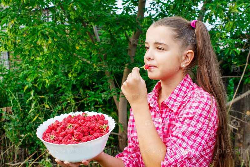 Девочка-подросток держит миску малины в саду
