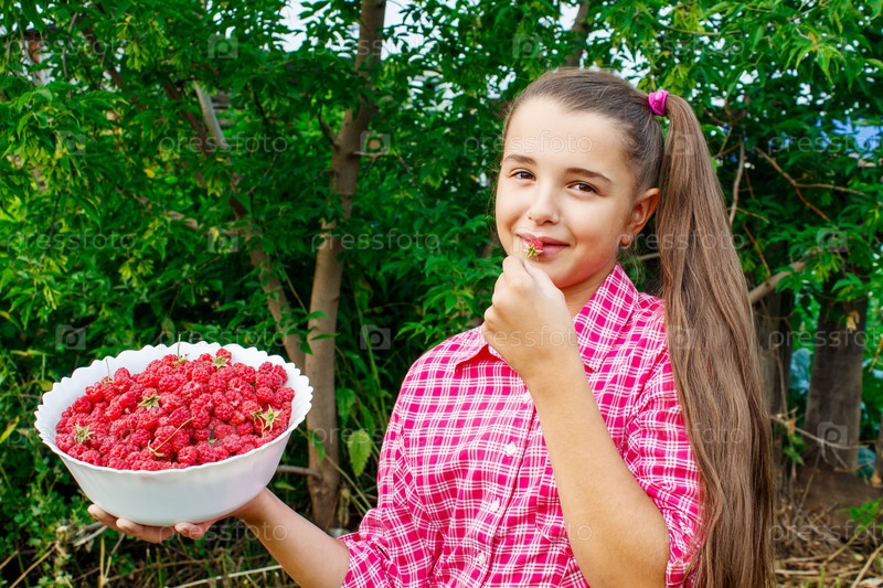 Девочка-подросток держит миску малины в саду