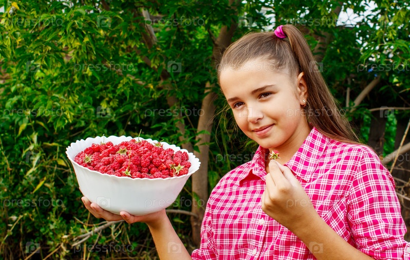 Девочка-подросток держит миску малины в саду