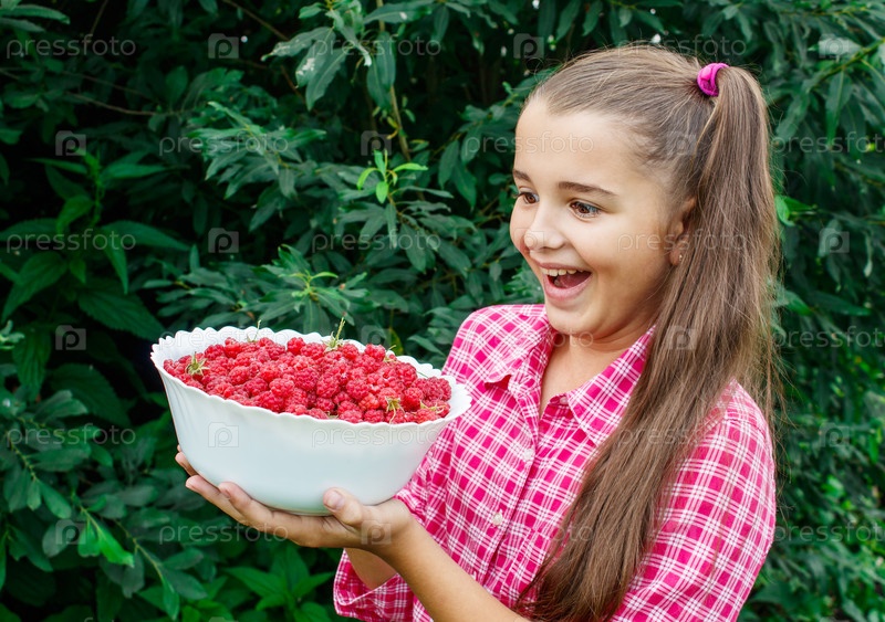 Девочка-подросток держит миску малины в саду