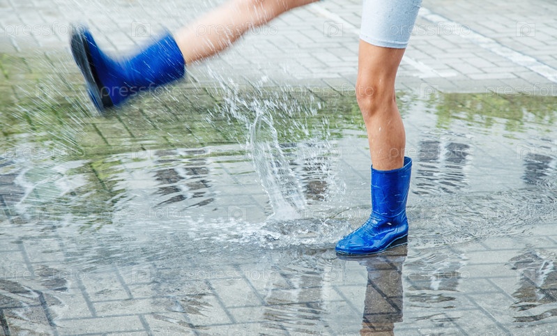 Девушка в синих резиновых сапогах прыгает в лужу после дождя
