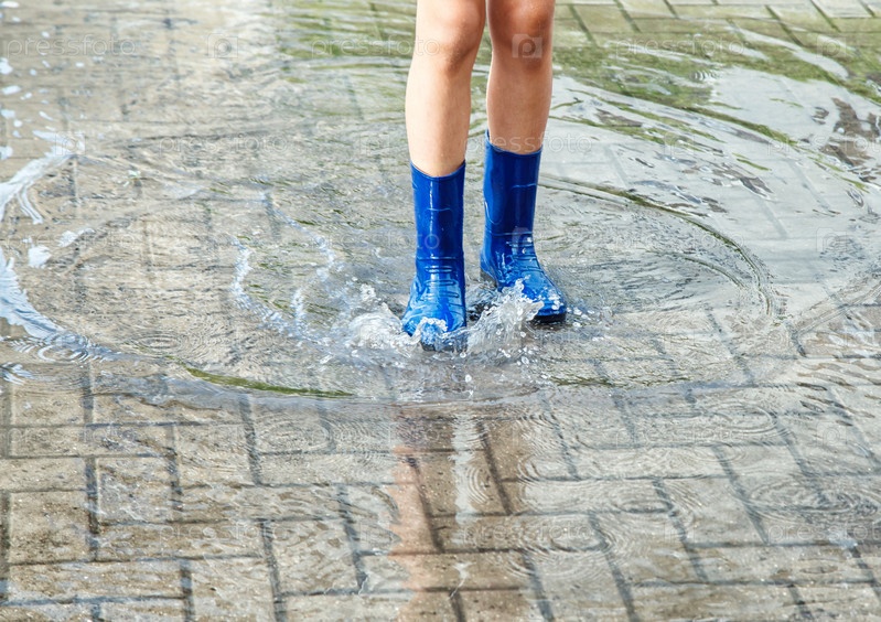 Девушка в синих резиновых сапогах стоит в луже после дождя
