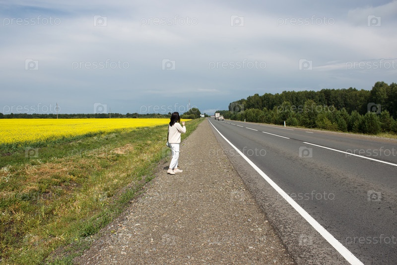 Молодая брюнетка останавливает машину жестом возле рапсового поля в летний день