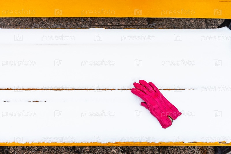 Красная перчатка на желтой деревянной скамейке, покрытой снегом