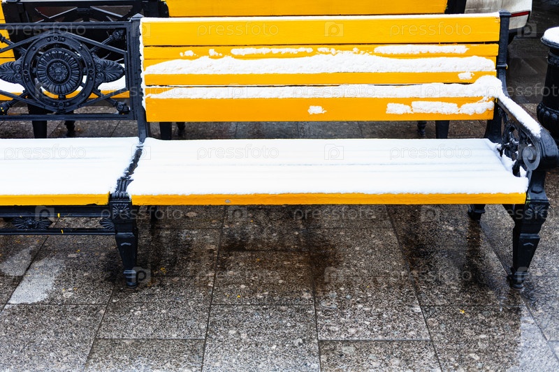 Вид спереди на желтые деревянные скамейки под снегом