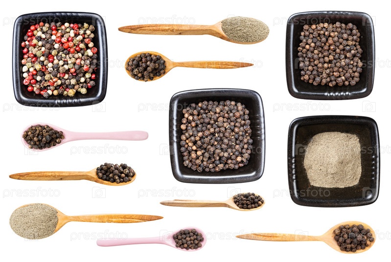 Набор различных черных перцев, изолированных на белом
