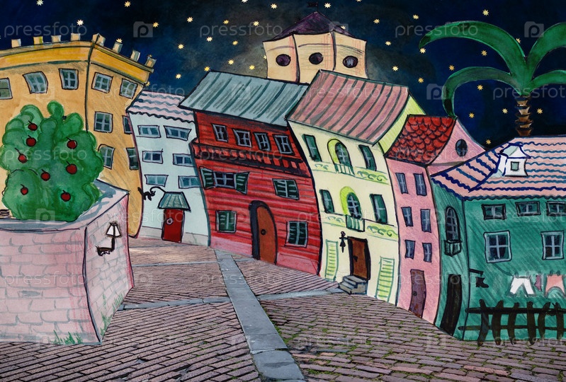 Ночной городской пейзаж - коллаж с нарисованными вручную домами