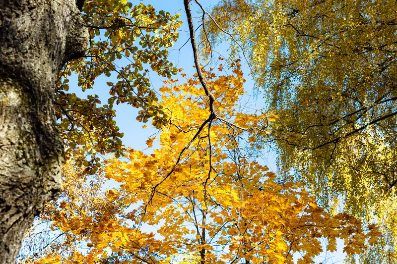 Вид снизу ветка дуба с оранжевыми листьями