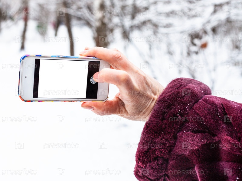 Женская рука фотографирует смартфон зимой