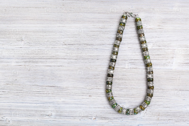 Вид сверху на старинное жадеитовое ожерелье на сером