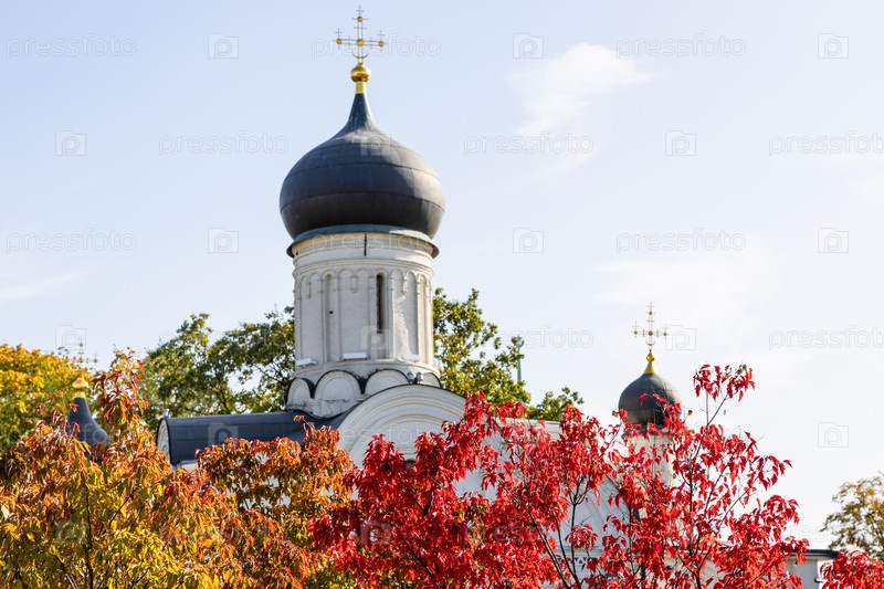 Осенняя листва и купол церкви в городе Москва