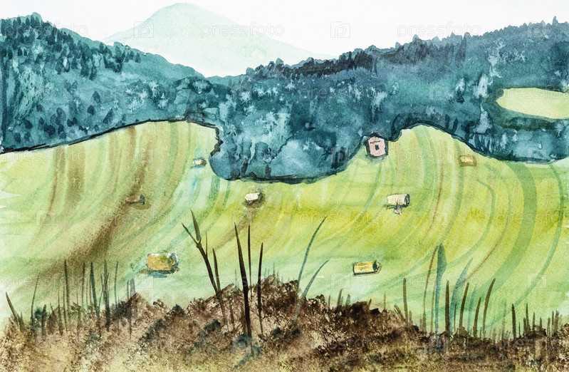 Ручная роспись убранного поля возле леса на холмах