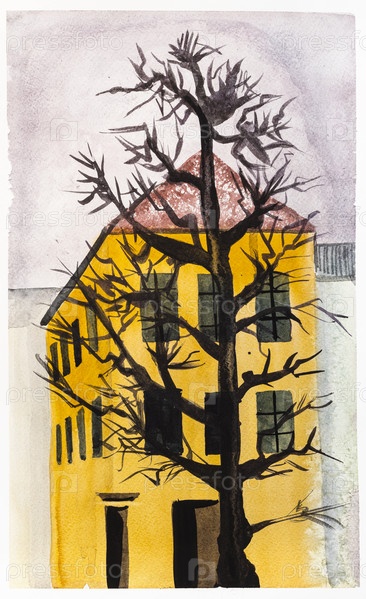 Старое голое корявое дерево перед желтым домом