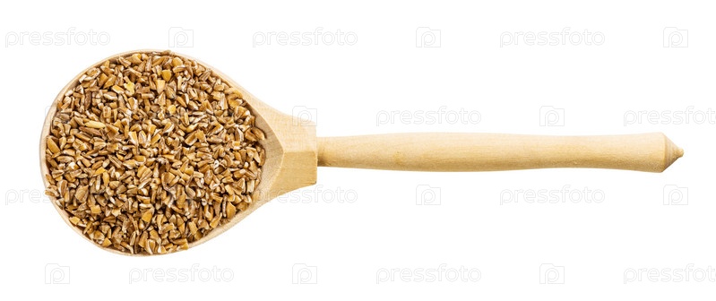 Вид сверху на ложку с измельченной крупой эммер фарро