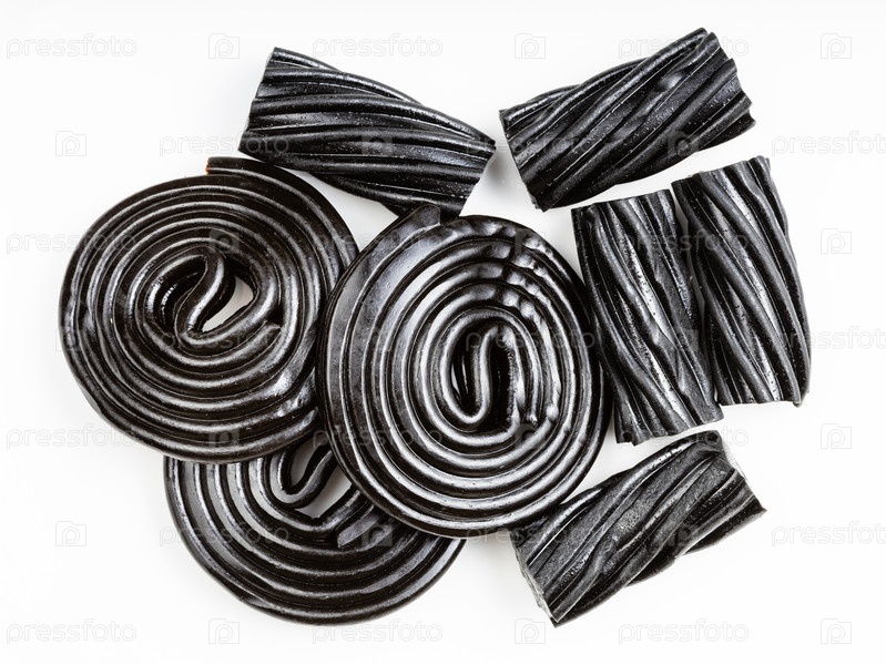 Несколько черных лакричных конфет крупным планом на белом
