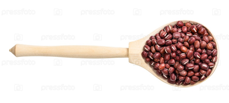 Вид сверху на сырые бобы адзуки в ложке изолированы