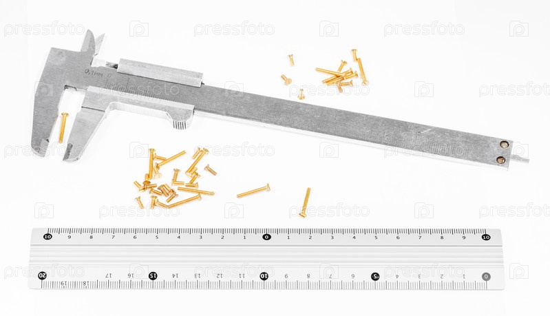 Штангенциркуль, металлическая линейка и множество латунных винтов