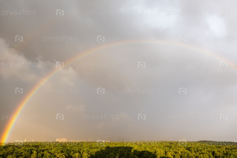 Большая радуга в сером голубом небе над залитым солнцем парком