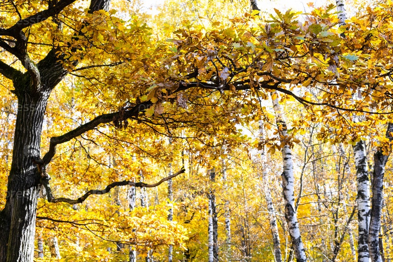 Дуб с желтой листвой и березы