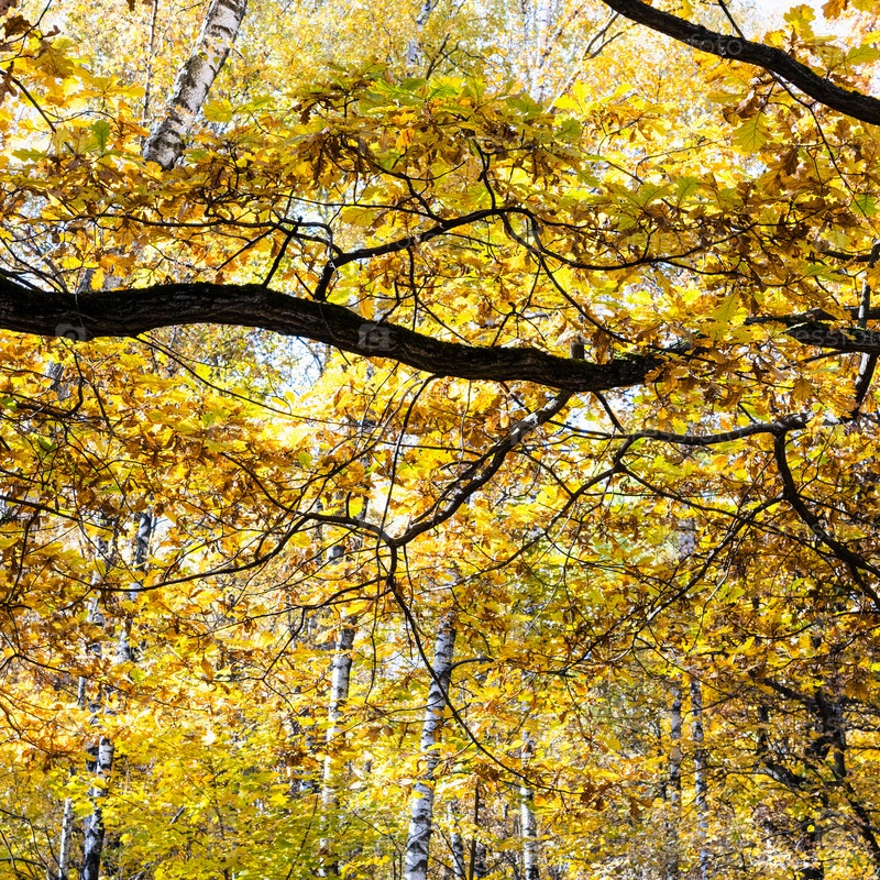 Ветвь черного дуба с желтыми листьями и березами
