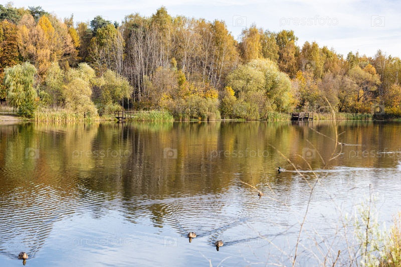 Желтые деревья и пруд с утками осенью