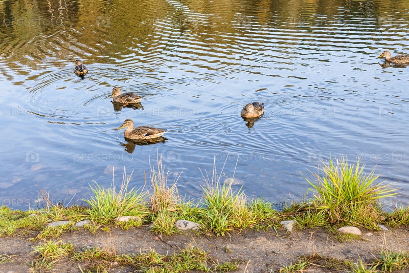 Несколько уток плавают у берега пруда в городском парке