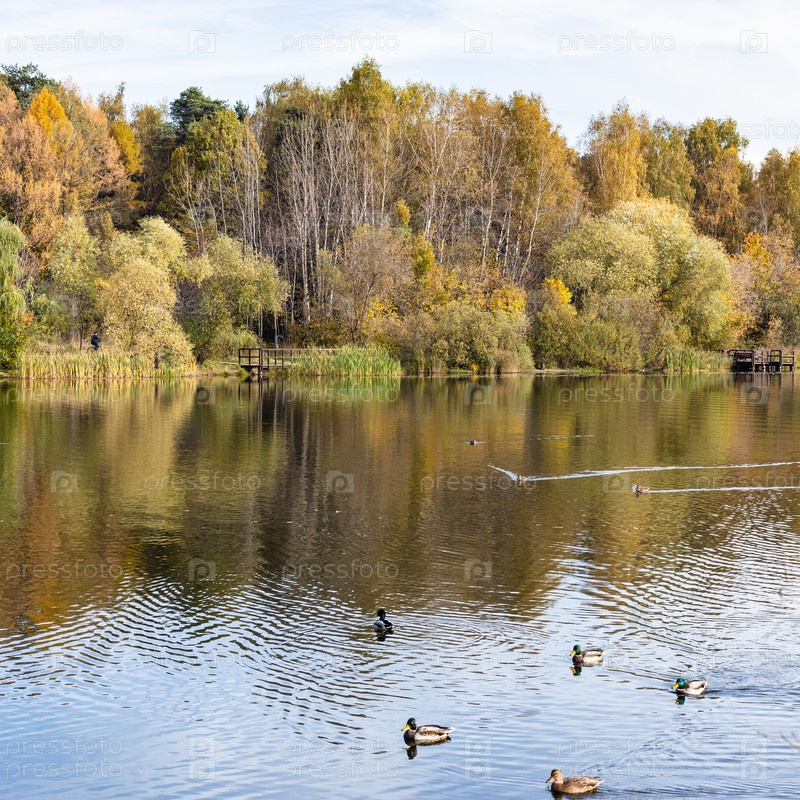 Пруд с утками и разноцветными деревьями на берегу